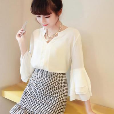 小羽家 2014初秋新款韩国名媛气质荷叶袖V领百搭雪纺衫上衣